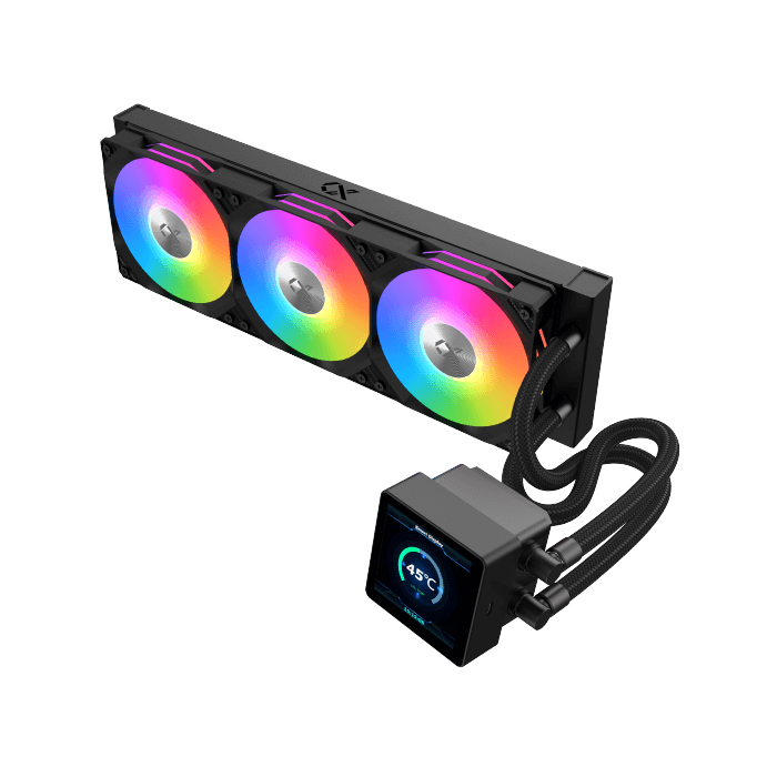 Boost cooling with the 360mm AIO Liquid Cooler featuring a 3.4″ LED display pump head, ARGB PWM fans, and a mini controller for powerful and stylish PC builds.
